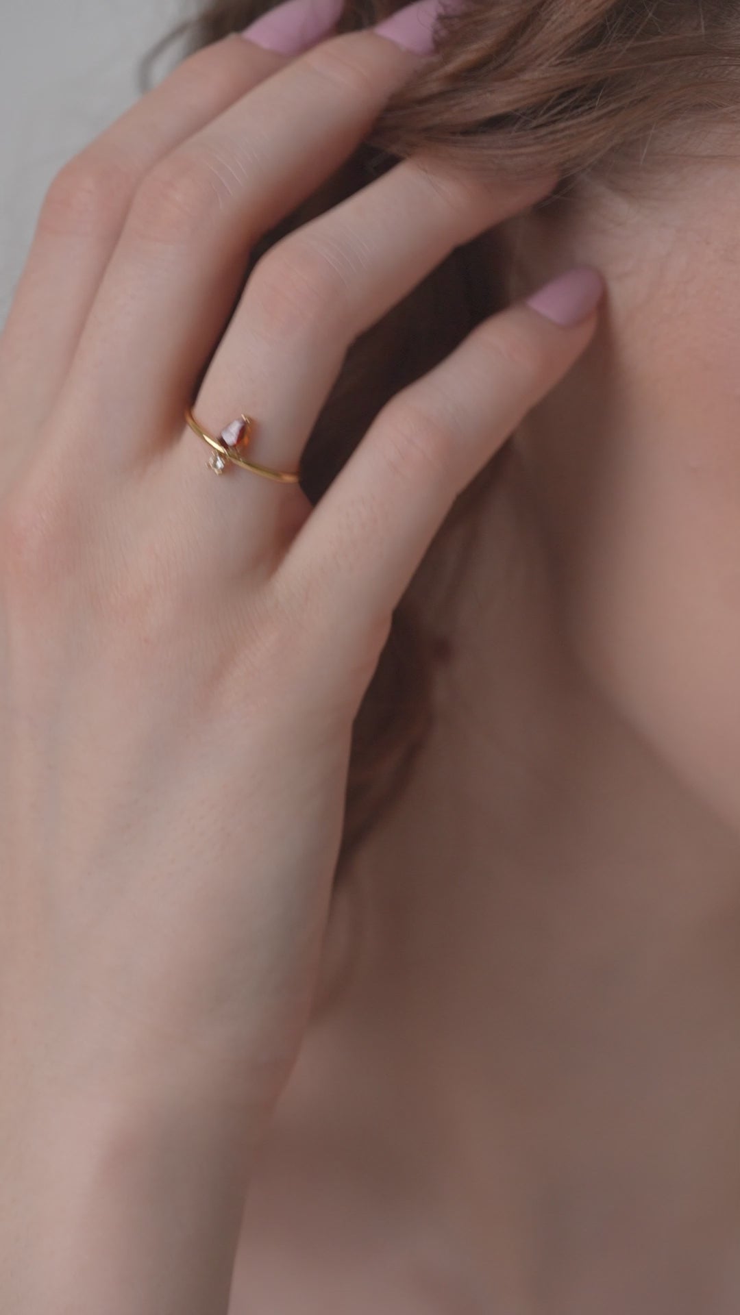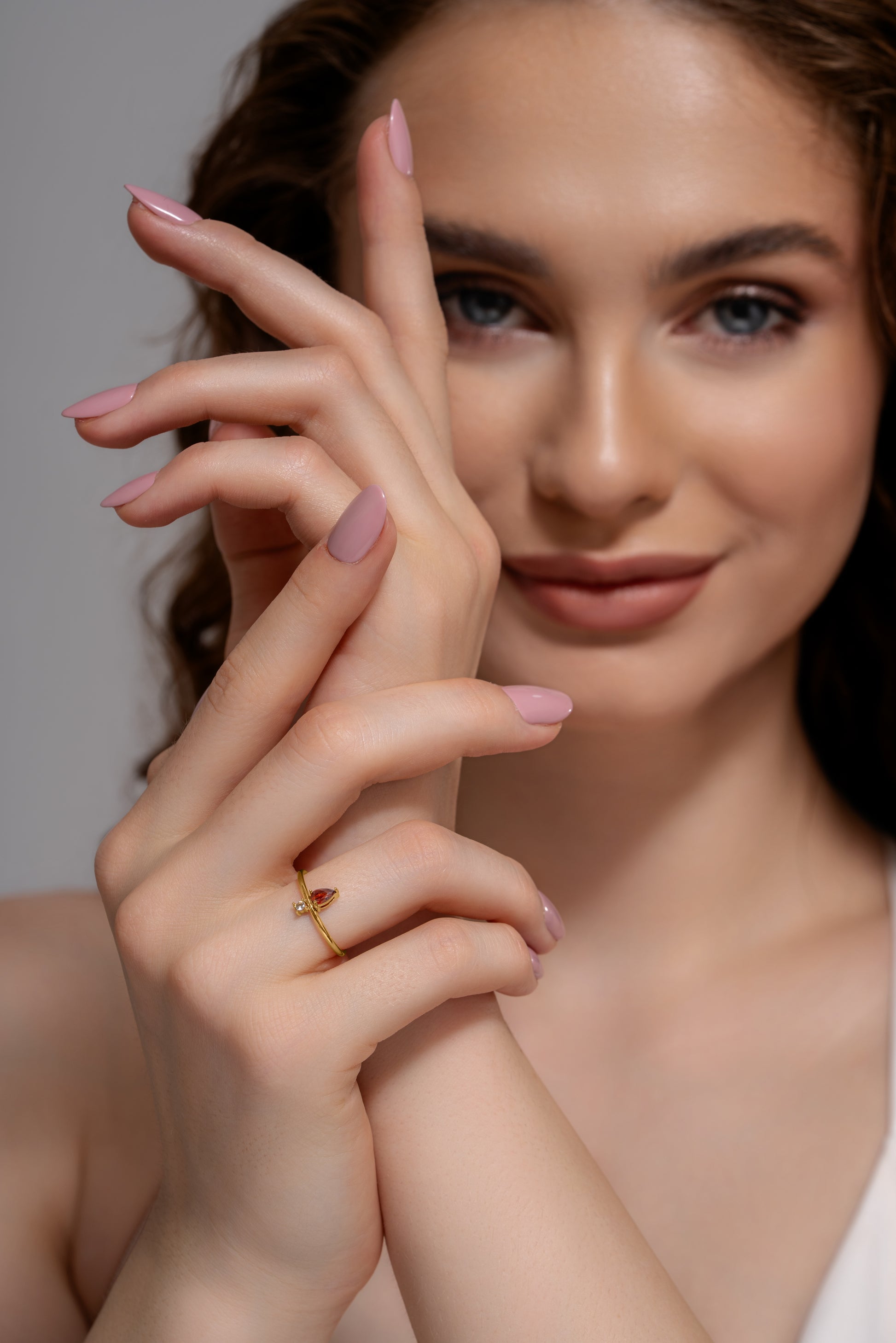 A delicate balance of boldness and grace. This open ring features a vivid crimson heart stone paired with a subtle zircon accent, set in 18k gold-tone over stainless steel. Minimal yet expressive — designed to add a soft statement to your everyday stack.